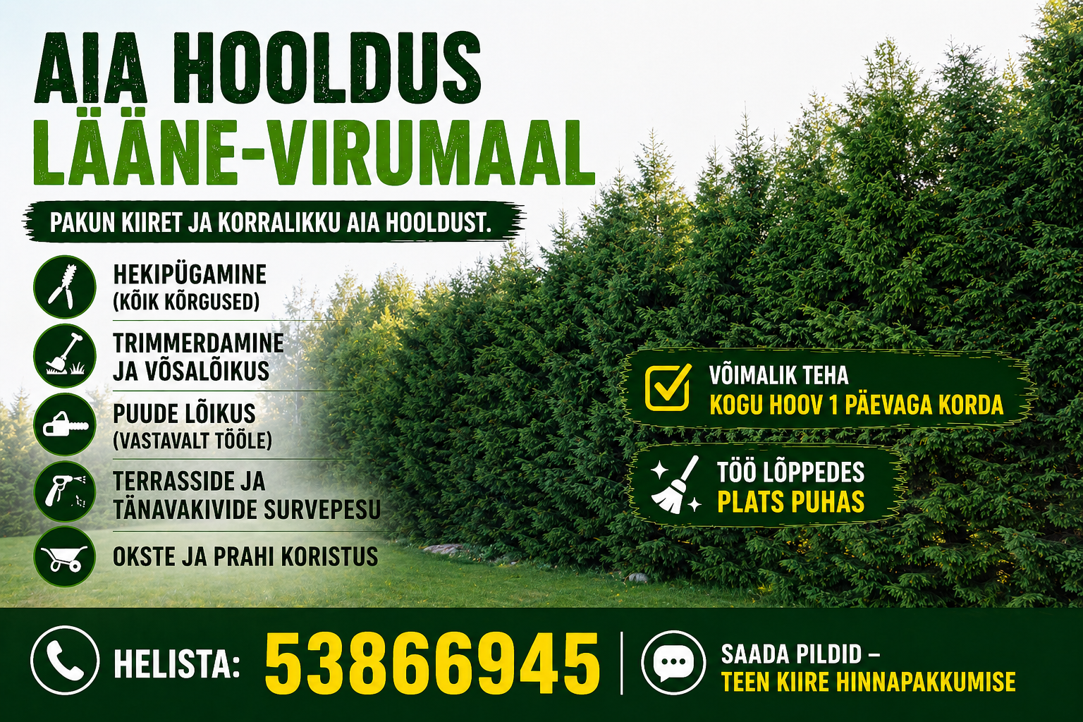 Pakun kiiret ja korralikku aia hooldusteenust Lääne-Virumaal. Sealhulgas: